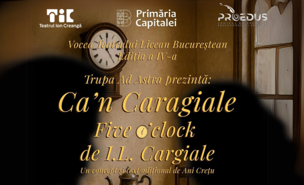 Al doilea titlu, „Ca’n Caragiale – Five o’clock”, pleacă de la binecunoscuta schiță satirică a lui Ion Luca Caragiale și este semnat de Ani Crețu, autoarea conceptului original și a textului adițional. Coordonatorii, din partea Teatrului, sunt Ani Crețu, director artistic, și Ioana Ginghină, actriță. Distribuția este compusă din elevi ai Liceului Tehnologic de Metrologie „Traian Vuia”, îndrumați de Mihaela Ignat, prof. de limba și literatura română și Robert Macriș. Trupa se numește „Ad Astra” și este formată din: Luca Tănase (Băiatul 1), Cassian Minciună (Băiatul 2), Andreea Sporea (Fata 1), Mateea Delcea (Fata 2), Anamaria Geangavelea (Fata 3), Răzvan Radu (Băiatul 3), Matei Bâzgan (Băiatul 4), Robert Tănase (Băiatul 5), Justinian Pascu (Chitarist 1), Mihai Ion (Chitarist 2), Erika Ianecica (Fotograf), Mihai Encuțu (Povestitor), Luca Dragomir (Valet), Desiree Șerban (Măndica), Maria Teodorescu (Tincuța), Cristina Urlan (Protopopeasca) și Claudiu Șerban (Mitică). Grigore Bianca s-a ocupat de costume, Antonio Minteu, de afiș, iar Mihnea Bătrânu de invitații.